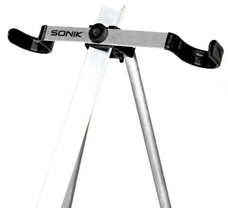 Het Sonik Wide Boy-statief is gemaakt van zeer hoogwaardig, gehoekt aluminium en heeft een handige traceerhaak onder de hoofdsteunen om een geprepareerde rig aan op te hangen. Zowel de hoofdsteun als de bekerstangen kunnen worden aangepast en omhoog of omlaag worden gepositioneerd langs de hoofdas van het statief om te passen bij de positie van de stangen. De 14 inch (35,5cm) brede cup en 14 inch (35,5cm) hoofdeenheid maken het gebruik van grotere molens met vaste spoel mogelijk, zonder dat de handgrepen vast komen te zitten aan de hoofdas. Het is ook geschikt voor gebruik met multiplier reels. Ultralicht en makkelijk mee te nemen in je hengelkoker!